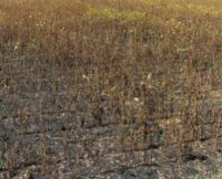 Severe charcoal rot in a field caused by soilborne fungus Macrophomina phaseolina. (Photo from Crop Protection Network Charcoal Rot publication CPN-1004).