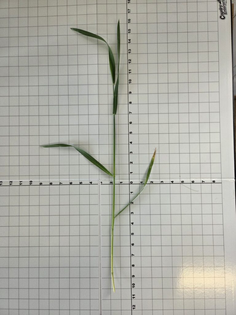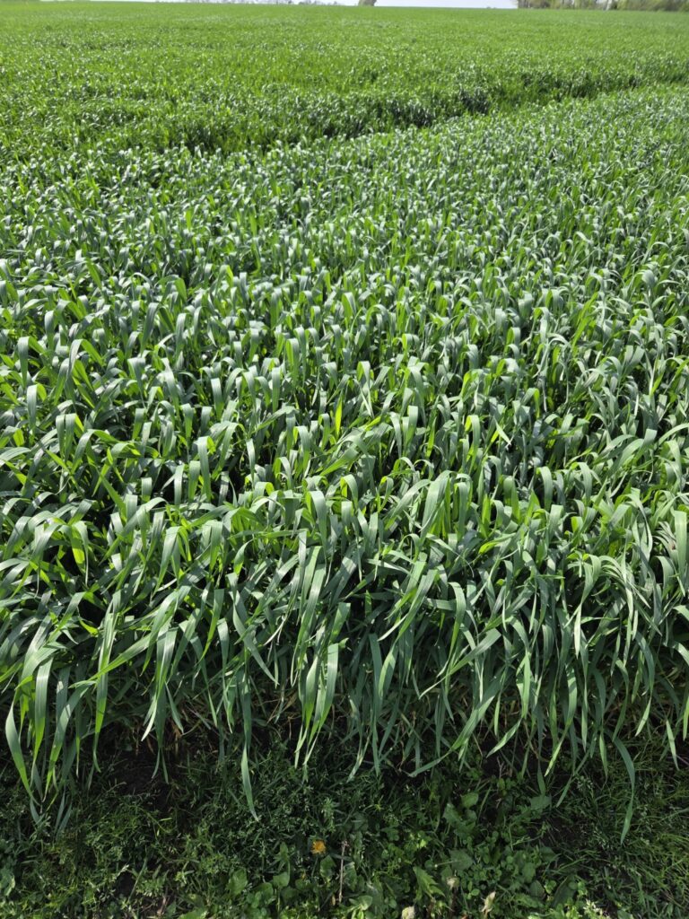With the rapid accumulation of GDUs this spring, wheat has already reached growth stage Feekes 8, the critical stage of flag leaf emergence. This leaf is responsible for most of the photosynthesis that drives head fill and grain production. Protecting it against disease and insect damage is important to optimize yield. No visible signs of disease yet, but conditions have shifted toward being favorable for development of several foliar diseases, and storms blowing in from the south could be carrying spores. I will be applying foliar fungicide applications to research plots today, evaluating potential benefits of flag leaf protection. Overlap areas on the nitrogen application are looking prone to lodging at this stage. In the photos, we can still see the freeze damage on the lower leaf and also a little damage near the stem on the middle leaves that appears to be some very early windowpane feeding by cereal leaf beetle. There are a few stink bugs milling about, which could cause problems later as the heads emerge. Time to scout and be diligent.
