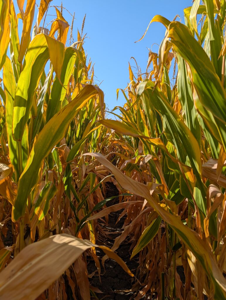 With only about an inch of rain over the past 30 days from a single event, the crop is drying down quickly in Northern Champaign County. Corn fields surveyed were generally at R6, or “black layer,” but are still a little way from harvestable. Most fields are still showing green leaf tissue above the ear leaf, but senescence will likely progress quickly with warmer weather in the forecast and minimal chances for rain at this time. Harvest operations were taking place in a couple of seed corn fields I drove by, but I didn’t see any combines rolling in production fields quite yet. Some soybean fields are at R8, or “full maturity,” and will likely be ready for harvest any day now, while others are still in the late R6, or “full seed,” stage—still green throughout much of the canopy. The couple of double-crop soybean fields I visited were at R5, or “beginning seed,” but may struggle to fill pods with the lack of available soil moisture.