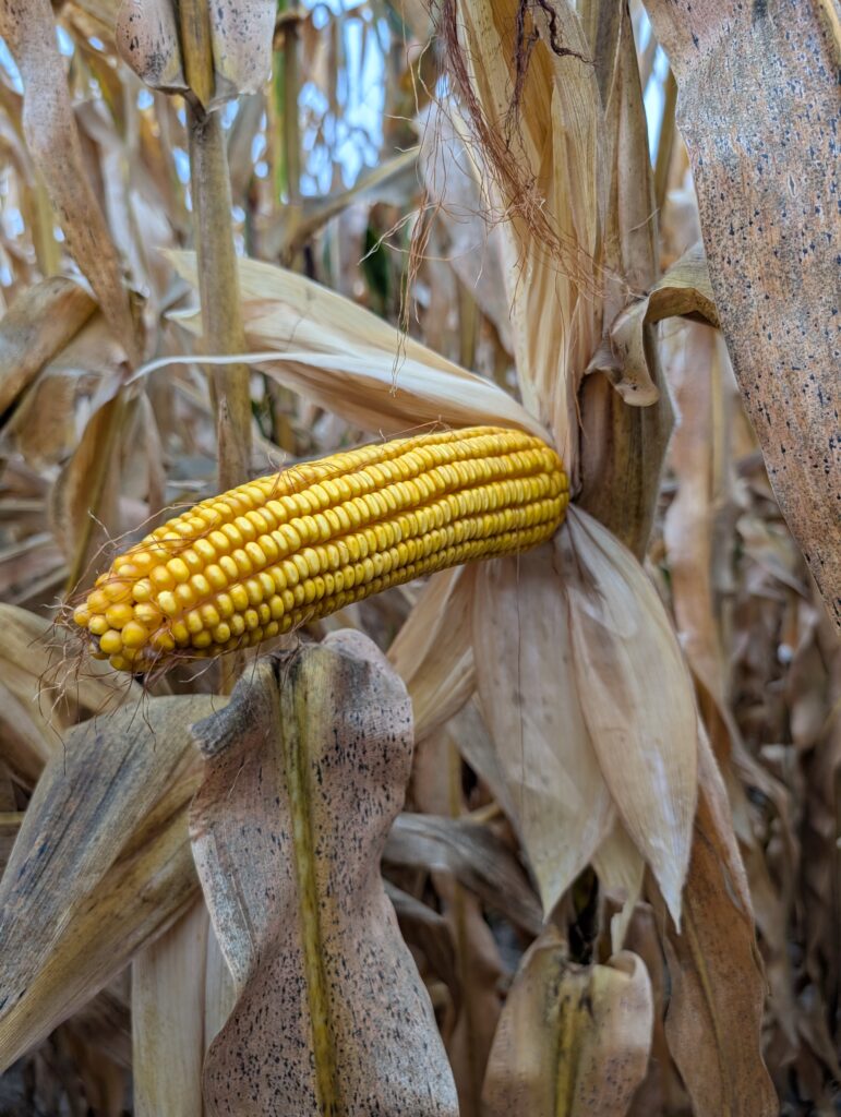 Harvested corn and soybean acres in Ford County were still low—perhaps 10%—with the recent rain stalling progress for a few days. At the time of my survey, more soybean fields had been cleared than corn fields, though there were still a number of corn fields fully harvested or at least “opened up.” All corn fields surveyed were at R6 (“black layer”), but about half were still showing some green in the upper canopy. Tar spot is also easy to find at this point in the season, with heavier pressure in the northern part of the county. However, it appears to have come in late enough not to have greatly affected yields, with relatively full ears on most plants checked during the survey. Of the full-season soybean fields surveyed, most were at R8 (“full maturity”), while the couple of double-crop soybean fields I stopped at seemed to be stuck in R5, struggling to fill pods.