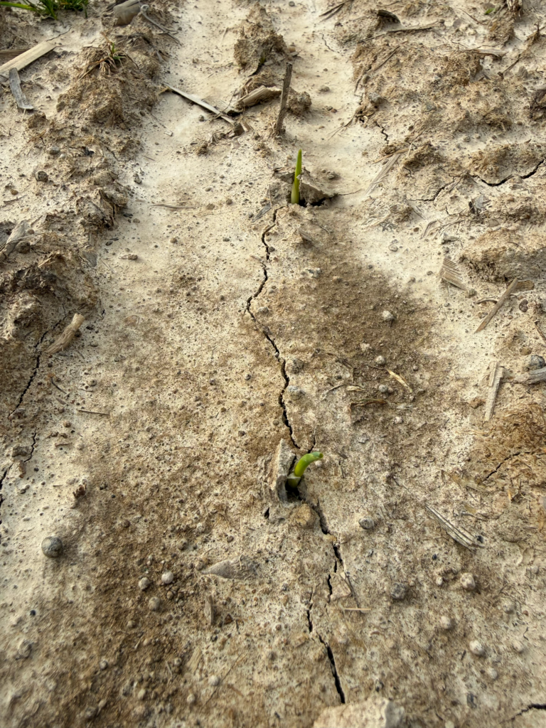 Caption: Corn planted March 31 just starting to spike through.
