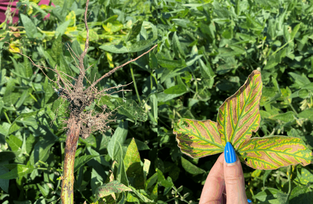 Stephanie and I saw some red crown rot in soybean fields around the Shelby/Macon County area, specifically in fields where she found it two years ago. The disease shows very visible symptoms, including yellowing and browning between the leaf veins (interveinal necrosis) as well as reddish discoloration at the base of the plant near the root. When you look at the root of a soybean plant infected with red crown rot, you’ll often notice white fungal growth (mycelia). Warm soil temperatures (77–86°F) are ideal for this fungus to thrive, so the recent warm days have likely contributed to its presence.