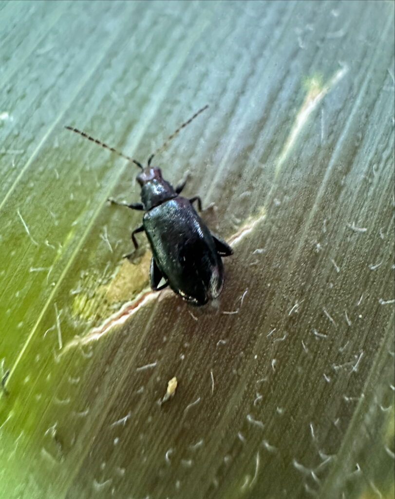 We had a few corn leaf aphid reports, but nothing approaching what we saw last year; those should be winding down as most of the crop progresses well into the reproductive stages. I’ve received several identification requests for the redheaded flea beetle, so I thought I would share a photo. These have been easy to find this year in both corn and soybeans; every few years, we see abnormally high numbers. As you can see from the picture, they resemble the corn flea beetle (the vector of Stewart’s wilt), but they are much larger—maybe 3/16″ to 1/4″ long—and have a reddish-brown head, as the name suggests. While they will feed on corn and soybean foliage and can be found quite easily in corn silks, I’ve never seen them approach economically damaging levels.