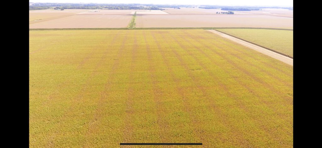 These aerial shots of our fungicide trial show how detrimental disease pressure can be. In this trial, we ran the same mix of max-rate premium fungicide, but delayed half the application by 10 days.