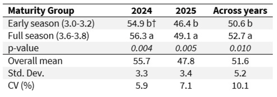 Double-crop soybean yield averaged 55.7 and 47.8 bushels/acre in 2024 and 2025, respectively. Maturity group had a small but consistent impact on double-crop soybean yield (Table 2). Full-season varieties (MG 3.6-3.8) yielded about 4% (2.1 bushels/acre) more than early-maturing varieties (MG 3.0-3.2), averaged across seeding rate and fertility treatments. The yield advantage of full-season varieties was likely associated with a longer reproductive period, as no fall frost injury was observed during either year of the study. These results are consistent with previous research indicating that, when frost risk is minimal, the longest adapted MG for the region often maximizes yield potential in double-crop soybean systems.
