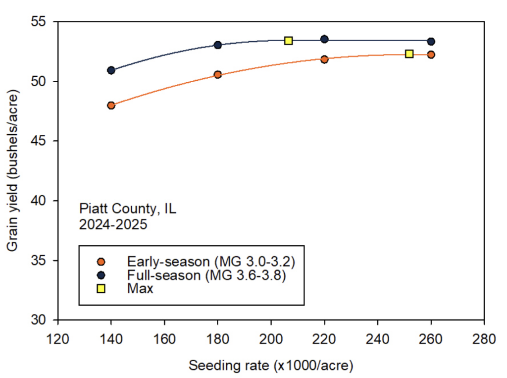 Figure 1. Double-crop soybean yield response to early- and full-season MG in Piatt County, Illinois. The yellow square indicates the seeding rate that maximized yield.