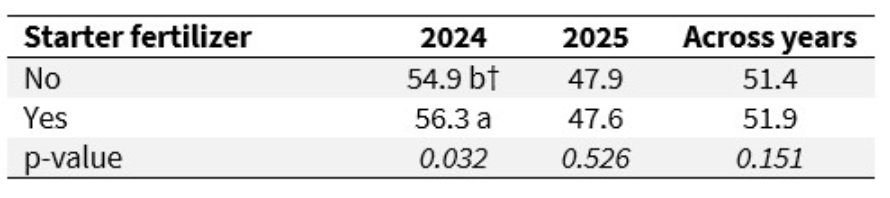 Table 3. Main effect of starter fertilizer on double-crop soybean yield (in bushels/acre) in Piatt County, Illinois. (†means followed by different letters differ at p ≤ 0.1)