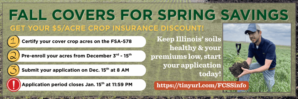 The Illinois Department of Agriculture (IDOA) opened pre-enrollment for the 2025–2026 Fall Covers for Spring Savings (FCSS) program on December 3rd, offering Illinois farmers a $5 per acre discount on their 2026 crop insurance premium for planting cover crops in fall 2025. The program is designed to support soil health, improve water quality and encourage adoption of conservation practices across the state.