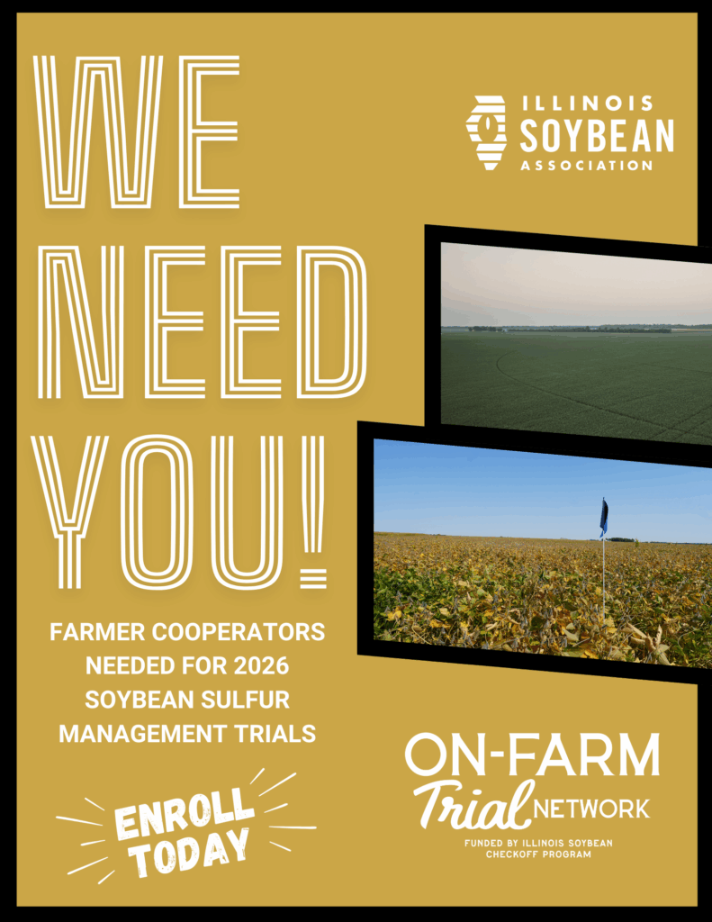 ISA's OFTN sulfur research will continue in 2026 with the introduction of a Sulfur 2.0 action trial protocol. This trial will give more Illinois farmers the opportunity to participate and learn about sulfur management of soybeans. To accomplish this, we are seeking farmer cooperators to conduct on-farm trials to determine the yield impact of soybean sulfur fertilization across different environments in Illinois. A special focus will be placed upon early planting and no-till situations.
