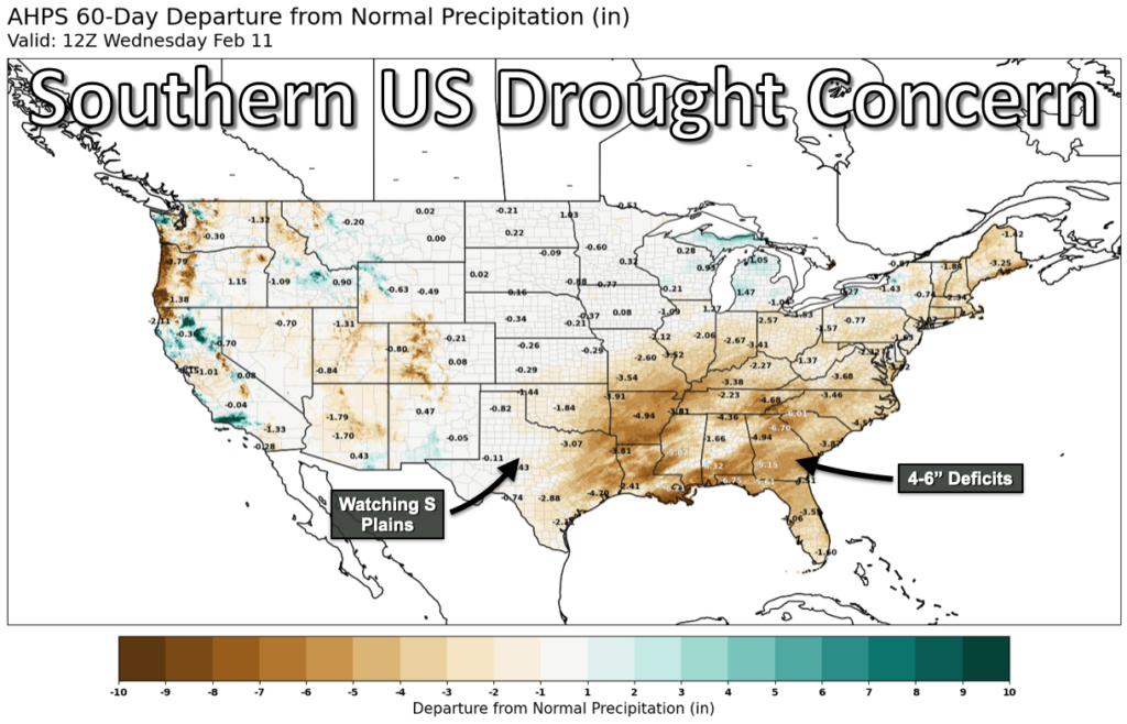 If there’s one area I’m watching more carefully, it’s the southern U.S., particularly the southern Plains and the Southeast. Both regions have seen relatively poor winter precipitation despite bouts of cold air and scattered rainfall events. Drought south of Illinois has a tendency to spread north later in the year, so my eyes often turn to Little Rock or Nashville during spring as bellwethers for what might be coming.