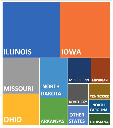 Figure 1. Relative proportion of soybean bushels produced in states reporting invertebrate loss estimates in 2024. These states represent 65.2 percent of the soybean production in the United States in 2024. The “Other States” category includes Alabama, Delaware, Georgia, Maryland, South Carolina, Texas, and Virginia.