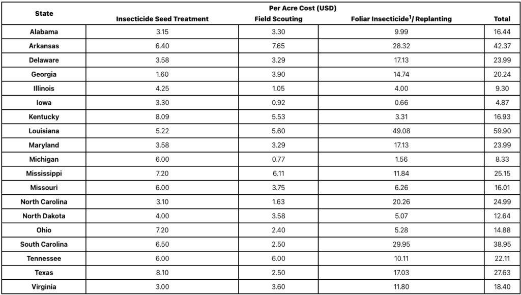 1 Alabama, Arkansas, Delaware, Georgia, Kentucky, Louisiana, Maryland, Mississippi, North Carolina, South Carolina, Tennessee, Texas, and Virginia; 2Does not include costs associated with seed treatments, crop scouting, and untargeted foliar insecticide application. The reported value consists primarily of foliar insecticide application.