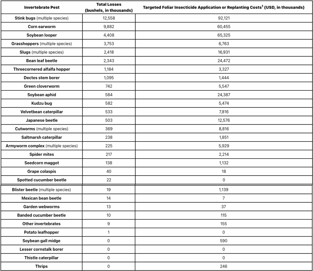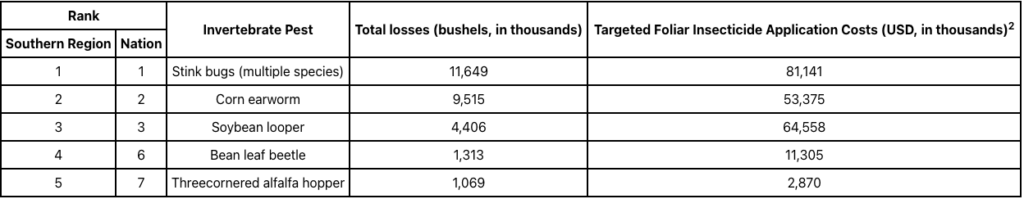 Table 3. Estimated soybean yield losses due to the five most significant invertebrate pests in southern soybean growing U.S. states1 in 2024 and associated targeted foliar insecticide costs.
