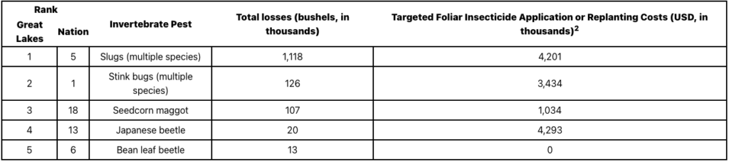 Table 4. Estimated soybean yield losses due to the five most significant invertebrate pests reported to have caused losses in the Great Lakes region U.S. states1 in 2024 and associated targeted foliar insecticide or replanting costs.