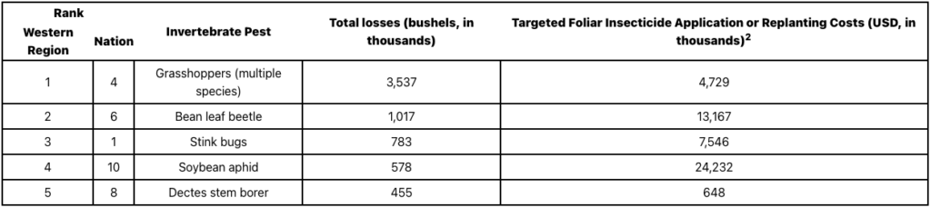 Table 5. Estimated soybean yield losses due to the five most significant invertebrate pests in western soybean growing U.S. states1 in 2024 and associated targeted foliar insecticide or replanting costs.