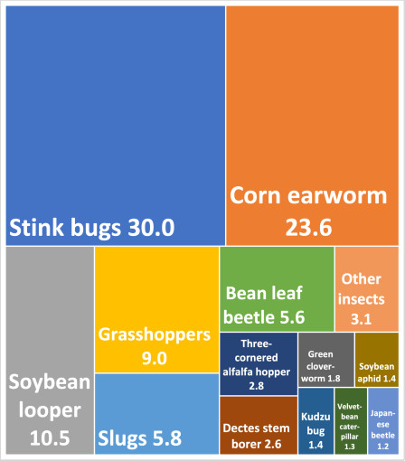 Figure 3. Common name and relative proportion (%) of estimated yield losses in 19 U.S. soybean-producing states for invertebrate pests in 2024. The “other insects” category includes armyworm complex, banded cucumber beetle, blister beetle, cutworms, garden webworms, grape colaspis, lesser cornstalk borer, Mexican bean beetle, potato leafhopper, saltmarsh caterpillar, seedcorn maggot, soybean gall midge, spider mites, spotted cucumber beetle, thistle caterpillar, and insects which were listed in the other insect category on the original data sheet.