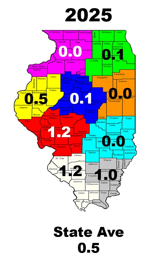 Soybean gall midge has still not been detected in Illinois after three years of statewide monitoring. In 2025, Kelly Estes, University of Illinois Agricultural Pest Survey Coordinator, and her team surveyed 200 soybean fields across 45 counties. Sweep-net samples were collected to monitor adult dectes stem borers and other soybean pests. Because soybean gall midge adults are extremely small and not typically captured in sweep nets, detection efforts rely on examining soybean plants, particularly along field edges where early signs of injury are most likely to appear. To date, no soybean gall midge has been found in Illinois.