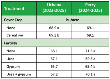 Figure 1. Average soybean yield (bu/acre) at Urbana and Perry across 2023-2025 growing seasons. Treatments with different letters are significantly different by the Fishers LSD test (p < 0.1).