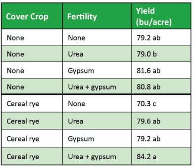 At the west-central trials near Perry, Preza Fontes found that the cereal rye cover crop did not lower yields. “Interestingly, lower yields were found on the sulfur-applied plots compared to all the others,” he comments. “These results were unexpected and it is not clear why yields decreased with sulfur application.”