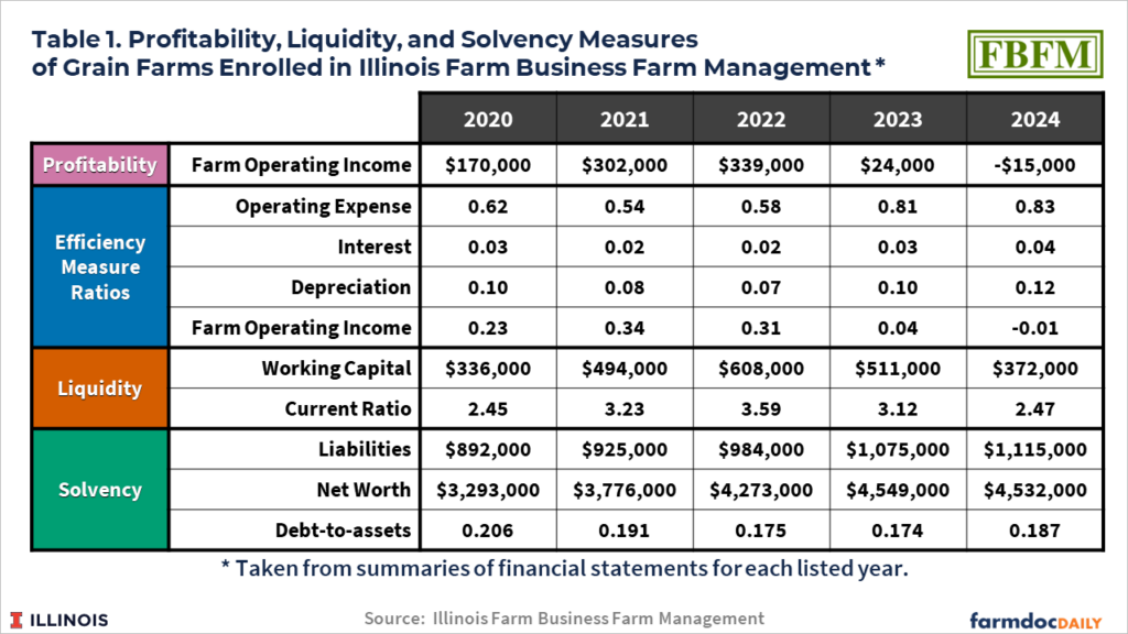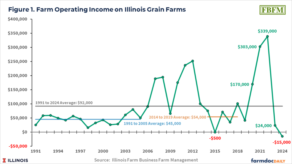 The current period of low grain farm profitability is placed in a longer-run context using financial data dating back to the 1990s, made available by Illinois Farm Business Farm Management (FBFM). Overall, 2024 was the lowest income year since the 1990s. While profitability currently is low, the liquidity and solvency positions of most grain farms remained strong at the end of 2024. However, continued low profitability will result in deterioration of liquidity and solvency. There is a need to lower operating expenses relative to gross farm returns. That will happen through higher grain farm prices, lower operating expenses, or a combination of the two. If grain prices do not increase, the reduction in operating expenses will require difficult adjustments. However, the current period of low prices is unlikely to lead to a financial crisis like the one in the 1980s.