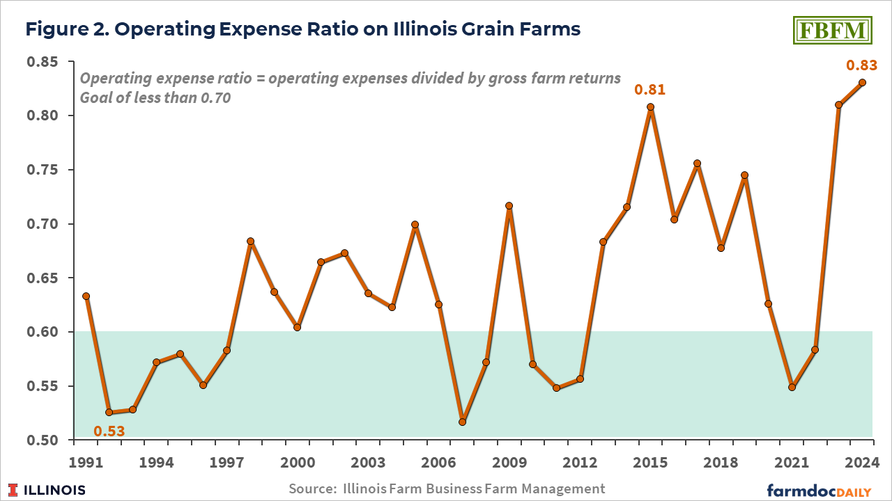The operating expense ratio exhibited a general trend up during the 1990s up to 2015 (see Figure 2). The operating expense ratio was 0.53 in 1992, reaching a high of 0.81 in 2015. The high in 2015 was associated with a decline in commodity prices and negative profitability. The 2024 value of .83 is the highest this ratio has been since 1990 (see farmdoc daily, April 9, 2025 for further analysis of the operating expense ratio).