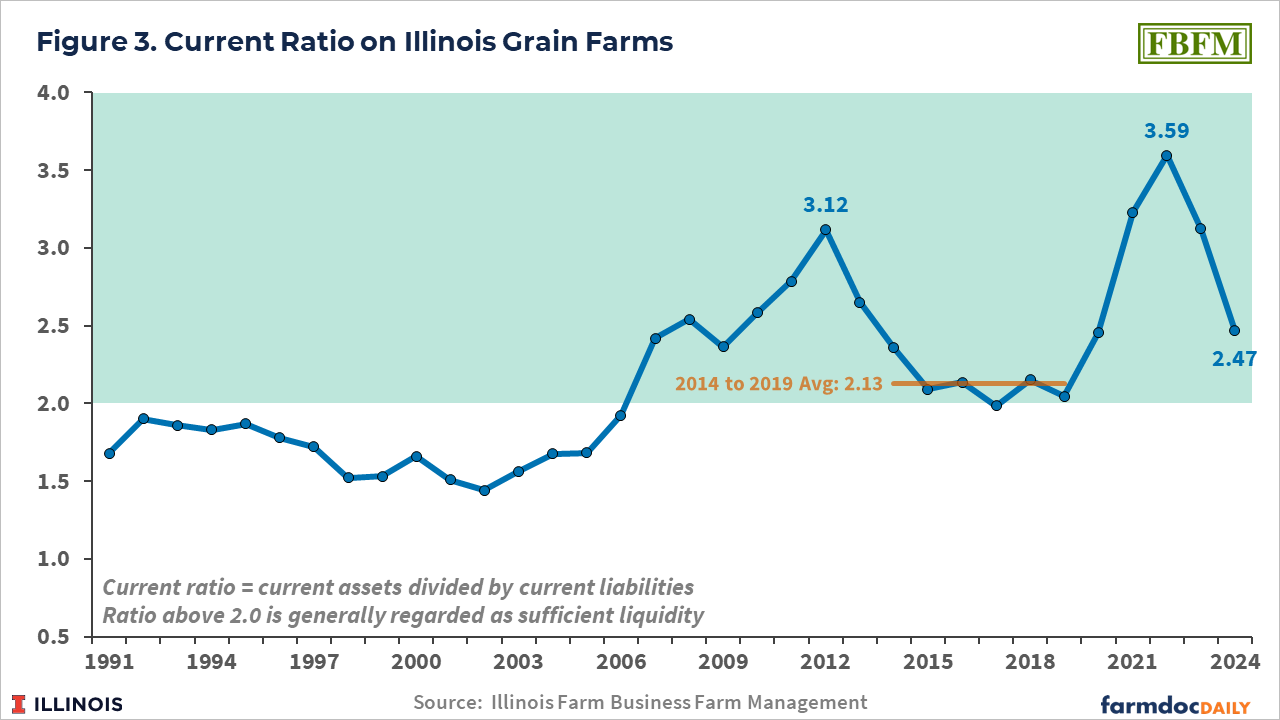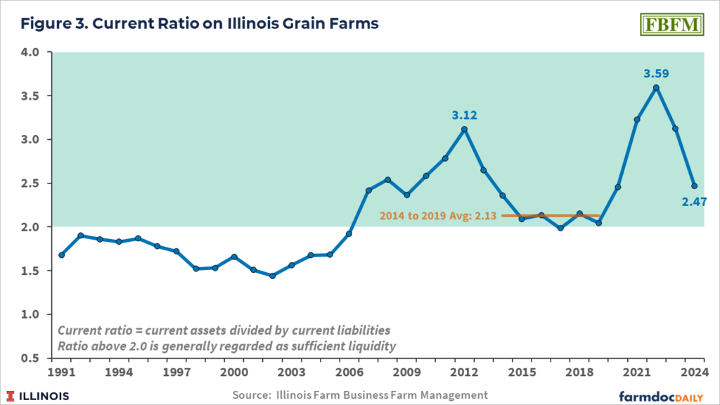Mashange, G., B. Zwilling and D. Raab. “The Liquidity of Illinois Grain Farms: Current Ratio.” farmdoc daily (15):6, Department of Agricultural and Consumer Economics, University of Illinois at Urbana-Champaign, January 9, 2025.