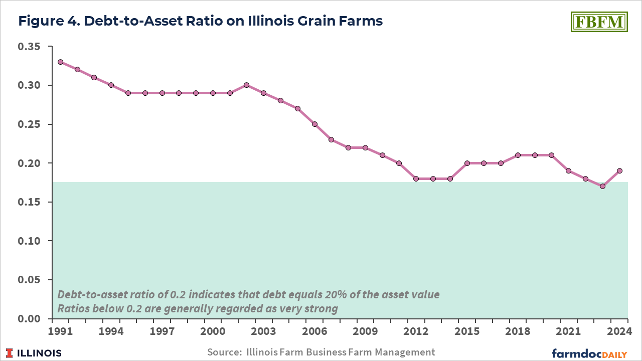 Over time, the average debt-to-asset ratio has declined from 0.33 in 1991 to 0.177 in 2012 (see Figure 4). From the 2012 low, the average debt-to-assets ratio increased to .209 in 2019. From the 2019 level, the debt-to-asset ratio decreased to 0.174 at the end of 2023, then increased to 0.187 at the end of 2024. The 2024 average represents a relatively low ratio from a historical perspective, and remains in the very strong category. Still, the increase from 2023 to 2024 was the largest yearly increase since 1991.