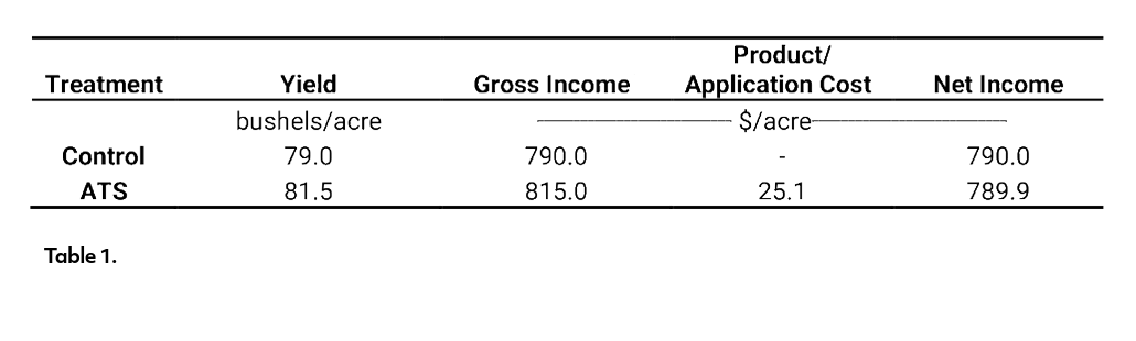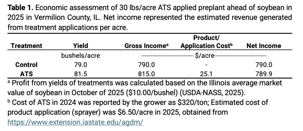 For this preliminary economic evaluation, only factors that differed between treatments were considered, including soybean yield, the price of grain at the time of harvest, sulfur product cost and application cost. Soybeans in October 2025 were $10 per bushel, ATS was priced at $320 per ton and the estimated cost of the sprayer application was $6.50 per acre (Table 1). All other management practices were consistent across treatments and therefore excluded from this analysis.