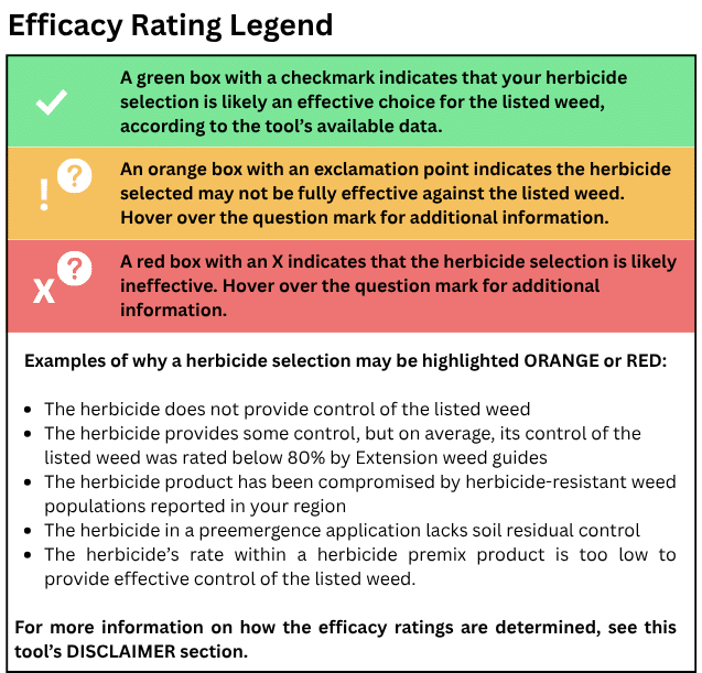 Check My Herbicide Plan determines herbicide efficacy based on a number of factors. These factors are explained in the plan’s efficacy rating legend and disclaimer page. (Graphic credit: Emily Unglesbee, GROW)