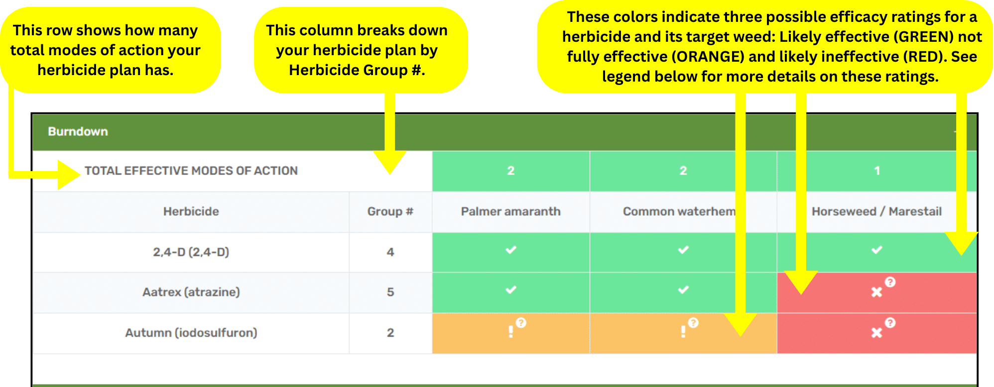 The Check My Herbicide Plan results page shows your total effective modes of action, based on three possible ratings for a herbicide and its target weed — effective, not fully effective and ineffective. (Graphic credit: Emily Unglesbee, GROW)