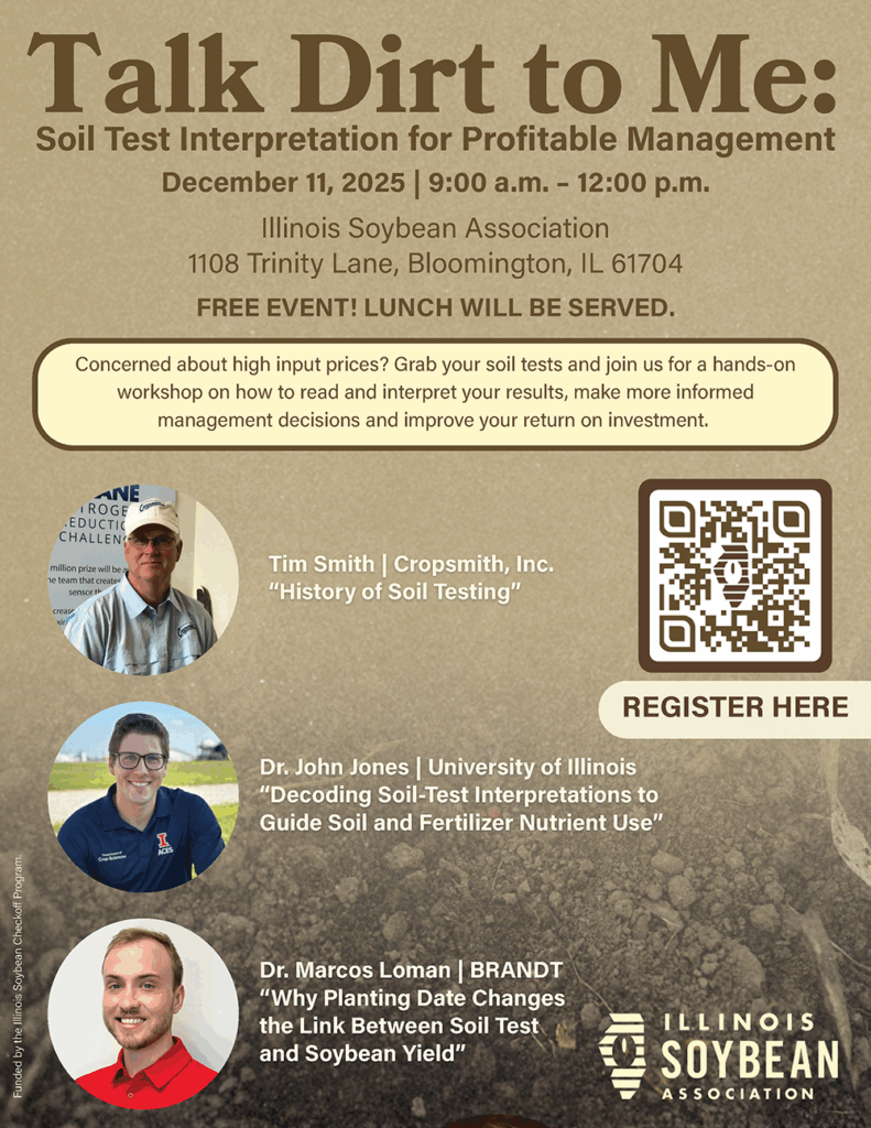 Tim Smith, president of CropSmith Inc., will kick off the event by discussing the history of soil testing to provide attendees background on how soil tests were developed, what they measure and why they are important. This foundation will lead into the next session featuring Dr. John Jones, an assistant professor of agronomy and soil fertility extension specialist at the University of Illinois, who will explain how to interpret soil test results to guide fertilizer management. Our final presentation, by Dr. Marcos Loman, strategic agronomy manager at BRANDT, will demonstrate how understanding soil fertility levels can guide management decisions to improve soybean yields. The event will conclude with a panel discussion featuring all three speakers, giving attendees an opportunity to ask questions about soil testing, interpretation and fertilizer management.